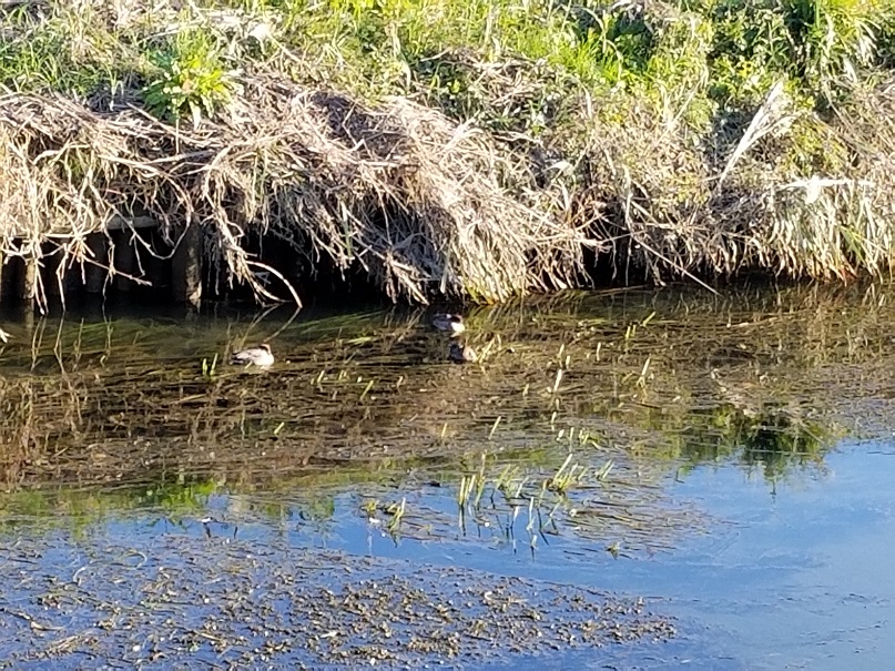 最近は雑草のトゲトゲに気をつけながら散歩をしなければいけませんが、水面では約20羽の鴨がグループ(?)に分かれて泳いだり寝ていたり、真っ白な鳥やグレーが混ざった鳥が休んだりしています。
